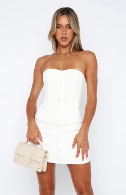 You will be the moment in the Attention Seeker Mini Dress in Mushroom. This stocking strapless mini dress features cut out bust/midriff design with diamantĂ© detail and delicate sheer fabric with stretch so one size fits most. We love this paired with clear mules and simple accessories and get ready to dance the night away!Â