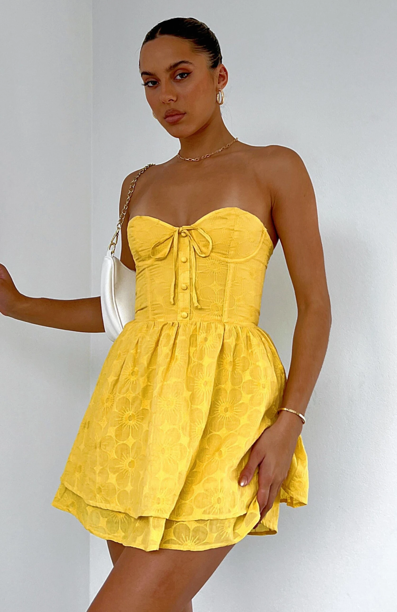 Dreaming of balmy summer holidays in the Flowers In The Rain Mini Dress in Buttercup. This strapless mini dress features bust underwire, tie and button front detail, boning in bodice, invisible zipper centre back and lined, broderie anglaise fabric. Pair with gold accessories and strappy heels for a look we love!