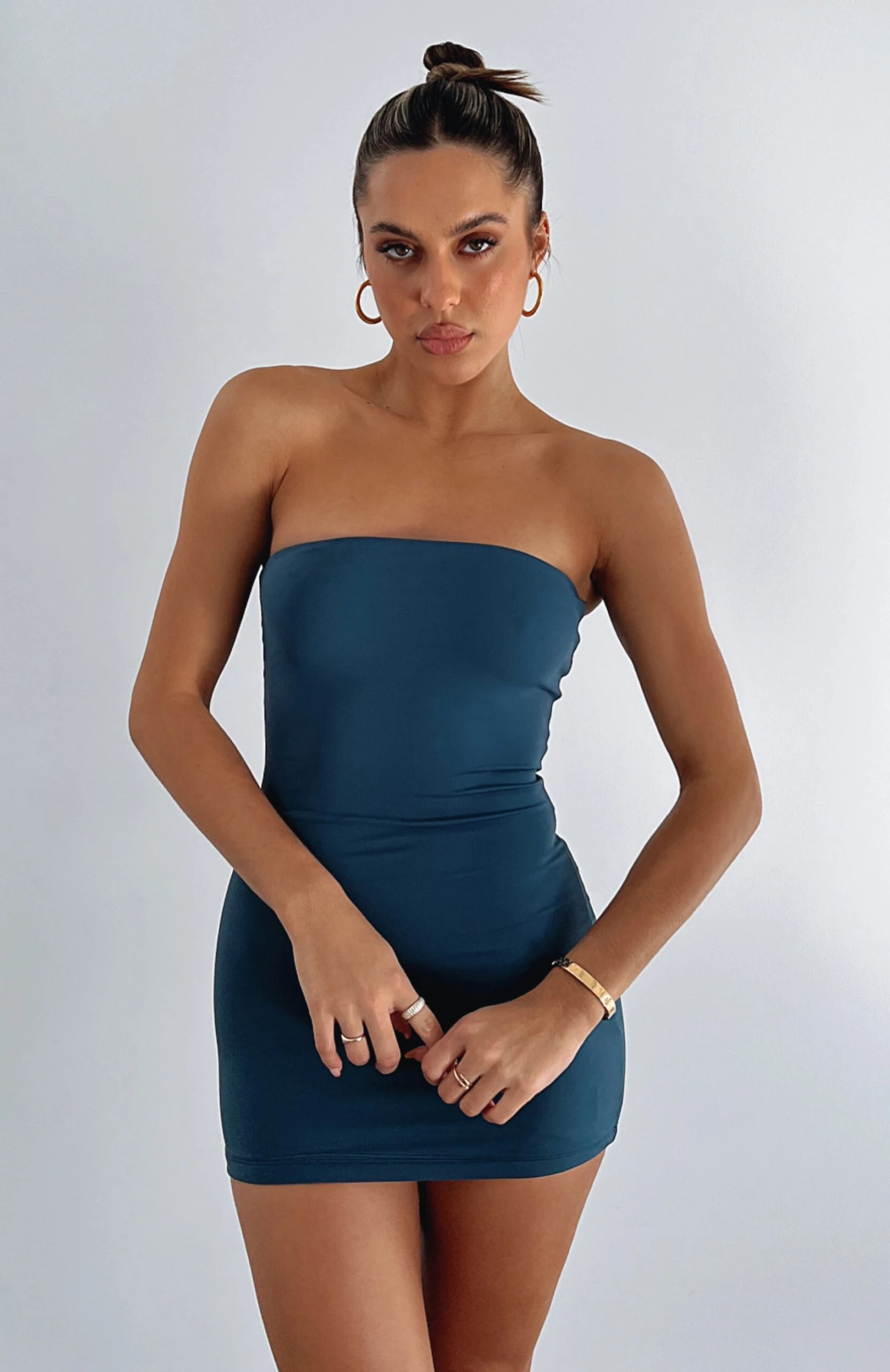 Make weekend styling simple with this must-have I’ve Got Plans Mini Dress in Dark Teal. This strapless dress features lined, stretch fabric and mini length. Pair with gold hoops and nude heels and get ready to turn heads.