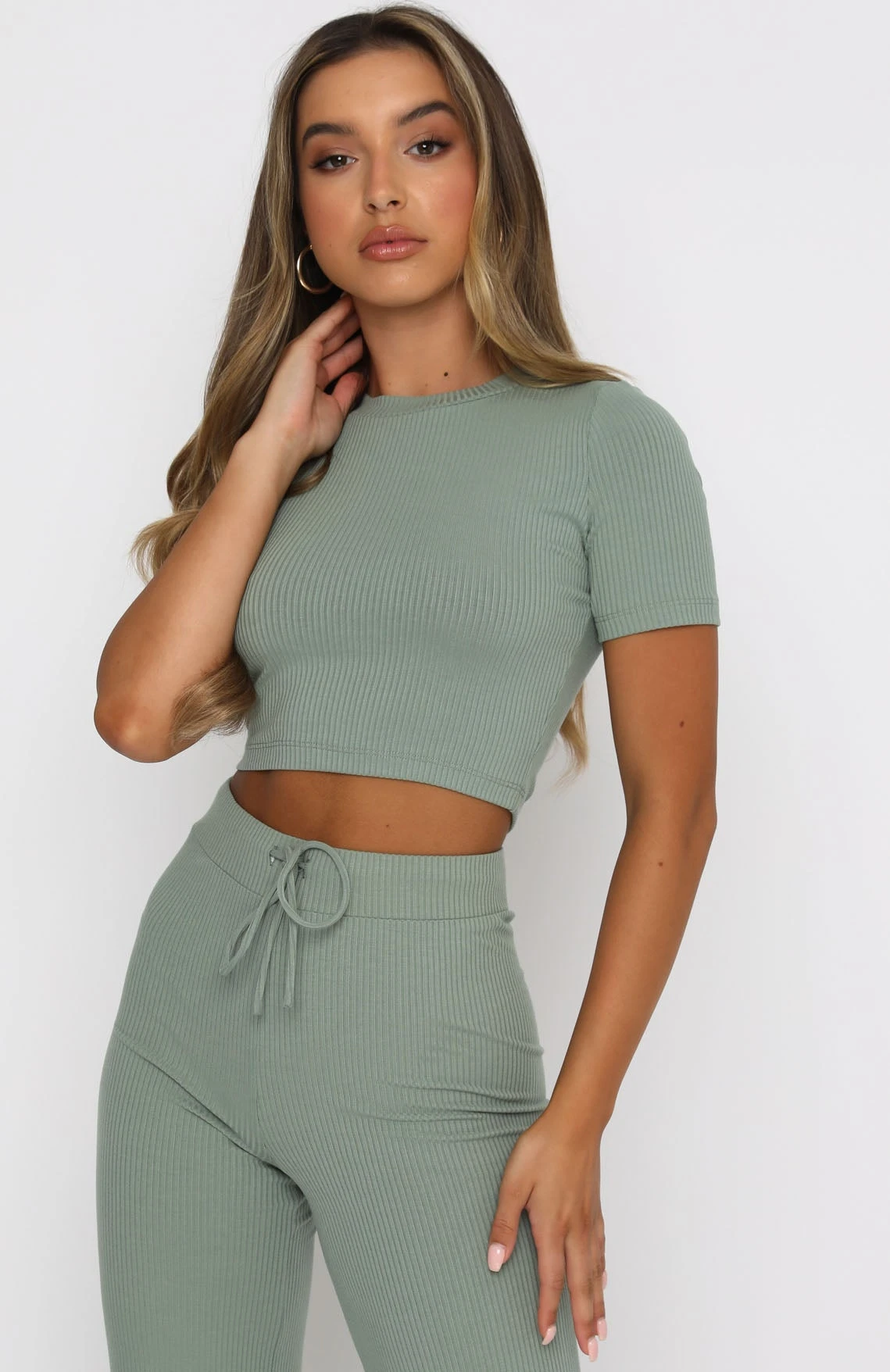 The Meant To Be Crop in Sage is the perfect basic for any wardrobe. This cropped top has shorts sleeves, high scooped neckline, and stretch ribbed fabric. Wear as a matching set with our Adore You Ribbed Pants or style your own with with shorts or jeans.Â