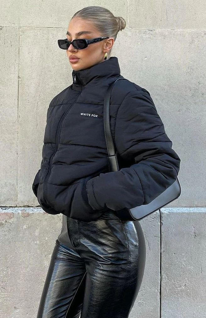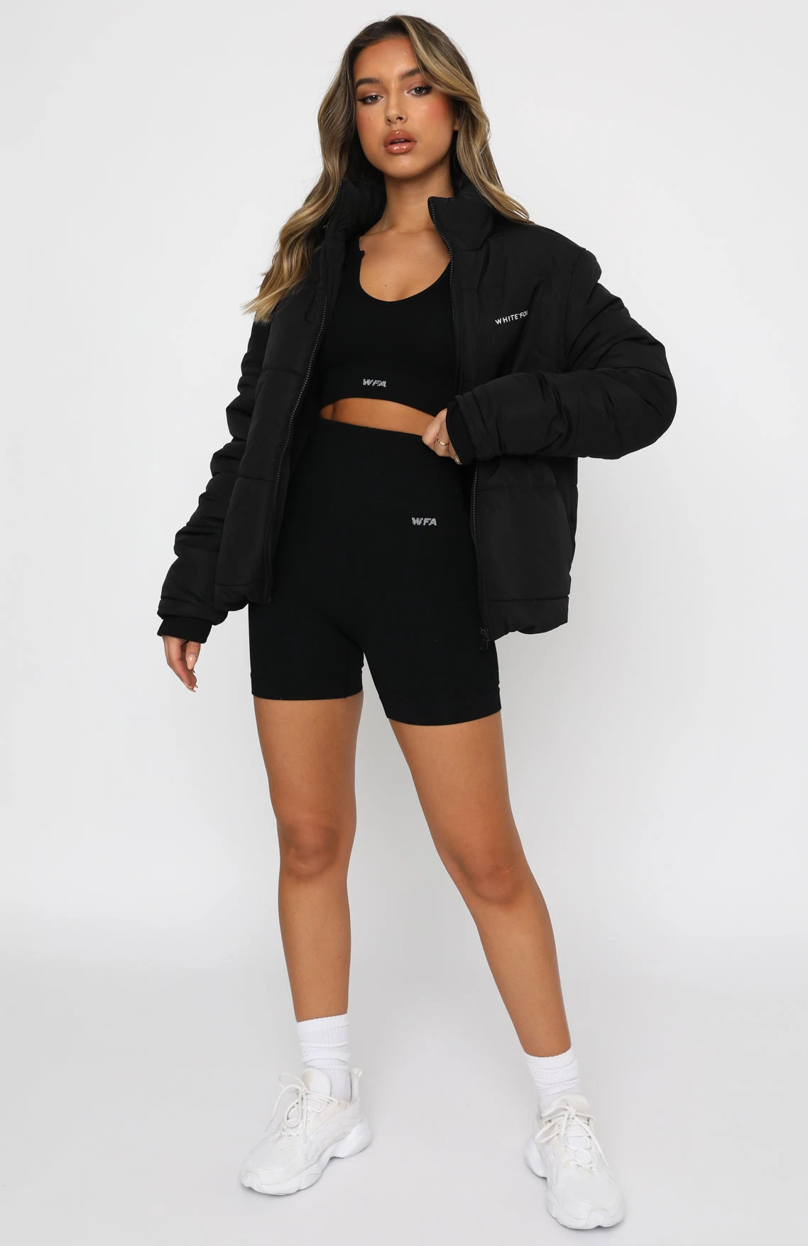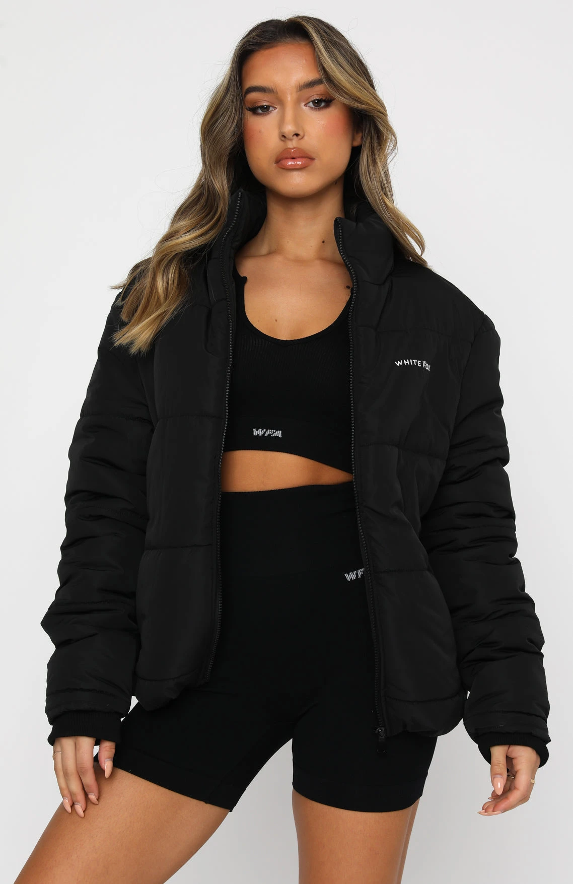 Keep warm look good in the Not Giving In Puffer Jacket in Black. Featuring functional zip closure, quilted sleeves and body, stand collar, front pockets and wf logo front side. This can be styled with any of your White Fox outfits for the added winter touch.