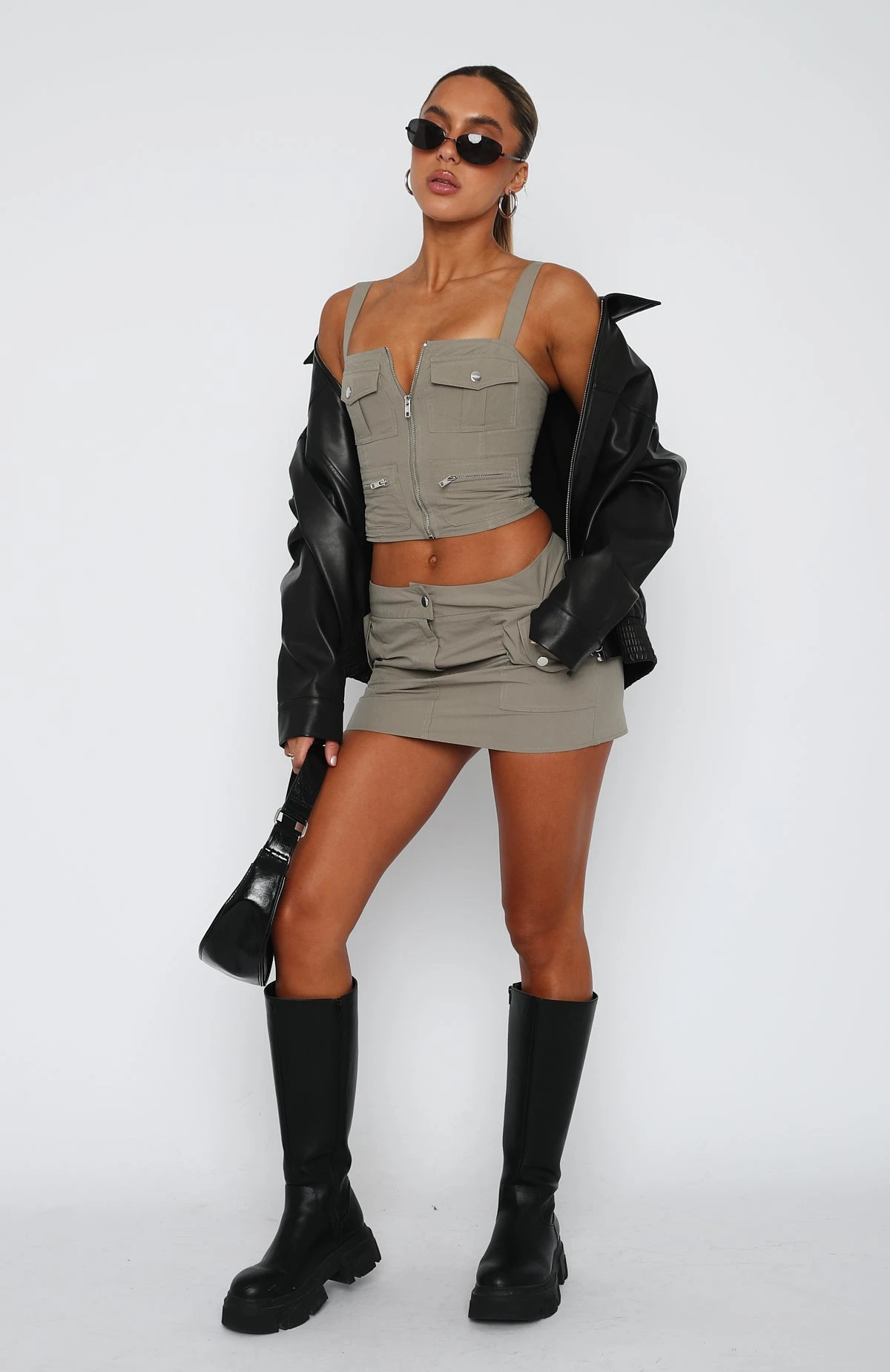 Add some structure to your look with the Play On Repeat Bustier in Dusty Olive. Featuring thick straps, zipper closure centre front, front pocket design and lined fabric. Pair with the matching When You Move Cargo Mini Skirt and knee-high boots for a dreamy combo!