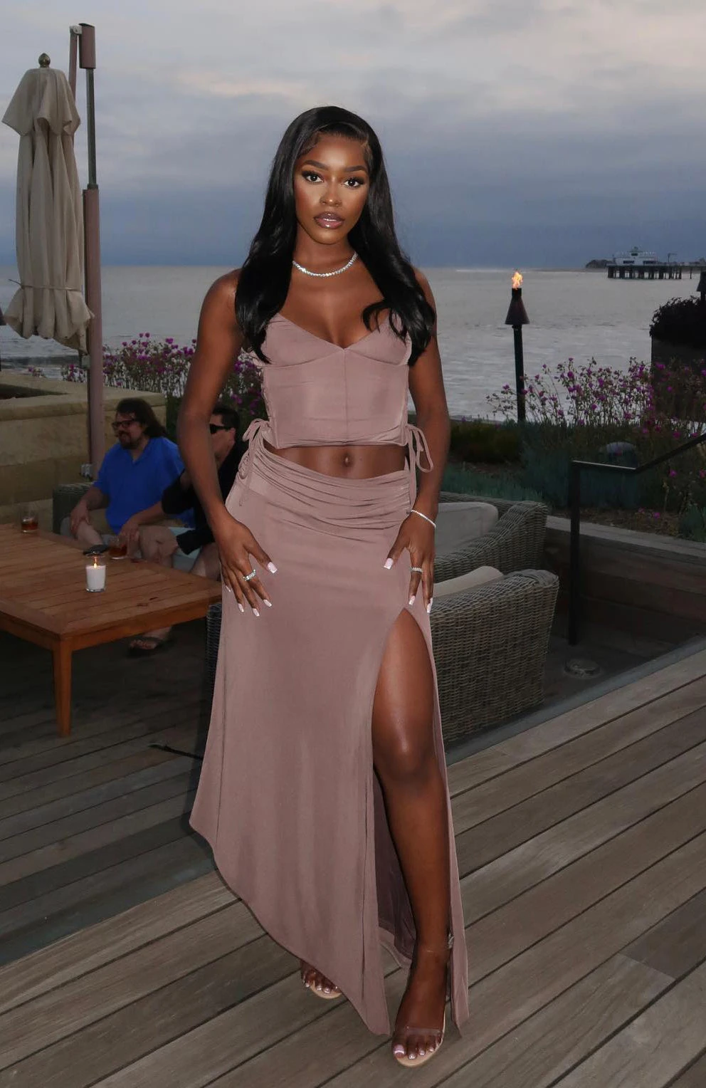 The set of your dreams is here! The Search For Love Crop in Mocha features thin, adjustable straps, plunge neckline, tie-up side design, boning in bodice and lined, fabric. We love this paired with the matching Love In The Sky Midi Skirt and platform slides for a dreamy combo!